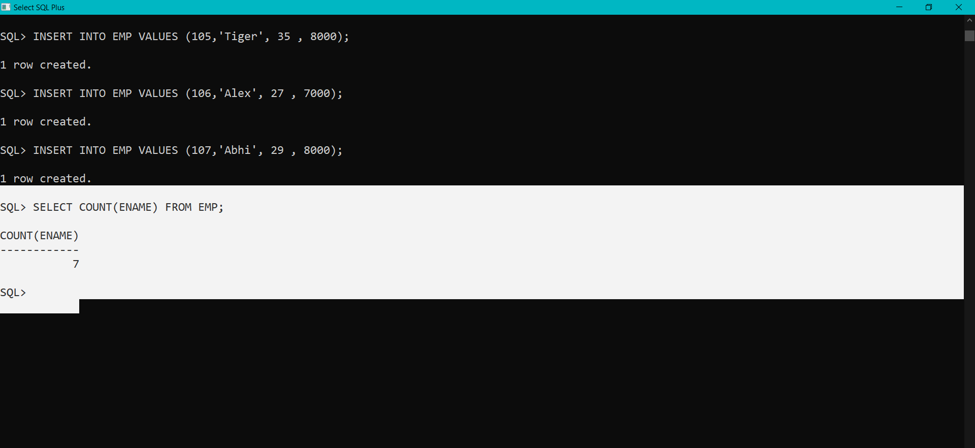 CREATE TABLE EMP (EID_NUMBER NUMBER, ENAME VARCHAR2(10), AGE NUMBER, SALARY NUMBER);